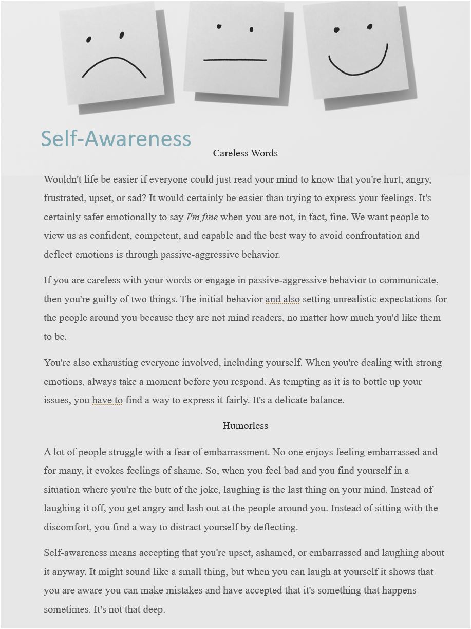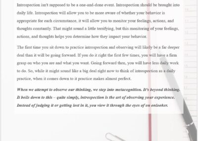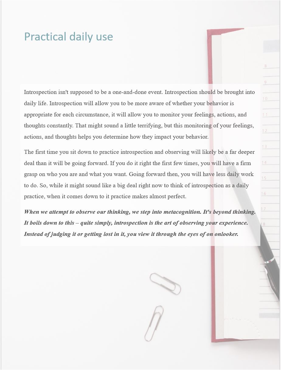 Introspection and reflection, Self-Awareness, A Deeper Understanding, Understanding vs. Improvement, Observing, Practical Daily Use, Actionable Introspection, and Actionable Awareness.